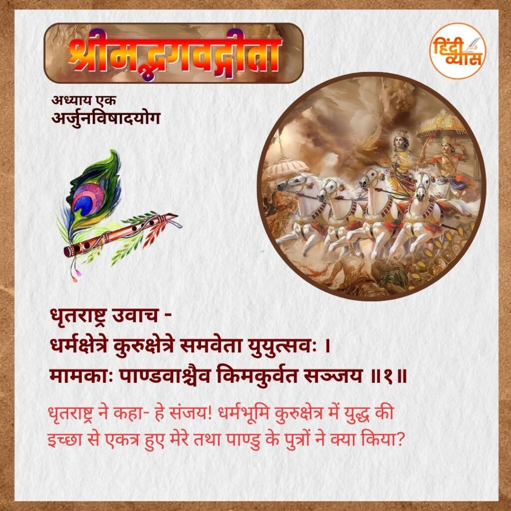 धृतराष्ट्र ने कहा- हे संजय! धर्मभूमि कुरुक्षेत्र में युद्ध की इच्छा से एकत्र हुए मेरे तथा पाण्डु के पुत्रों ने क्या किया?
