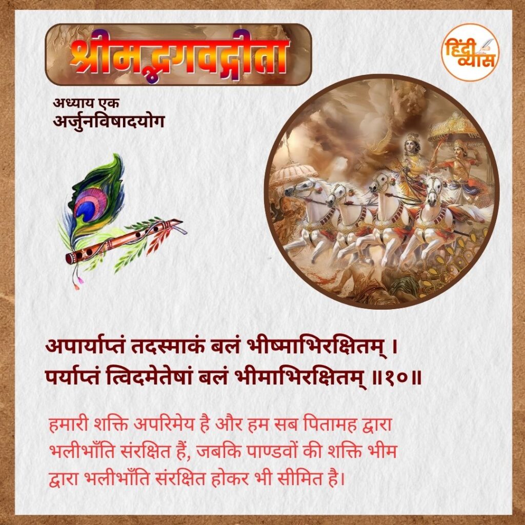 हमारी शक्ति अपरिमेय है और हम सब पितामह द्वारा भलीभाँति संरक्षित हैं, जबकि पाण्डवों की शक्ति भीम द्वारा भलीभाँति संरक्षित होकर भी सीमित है।
