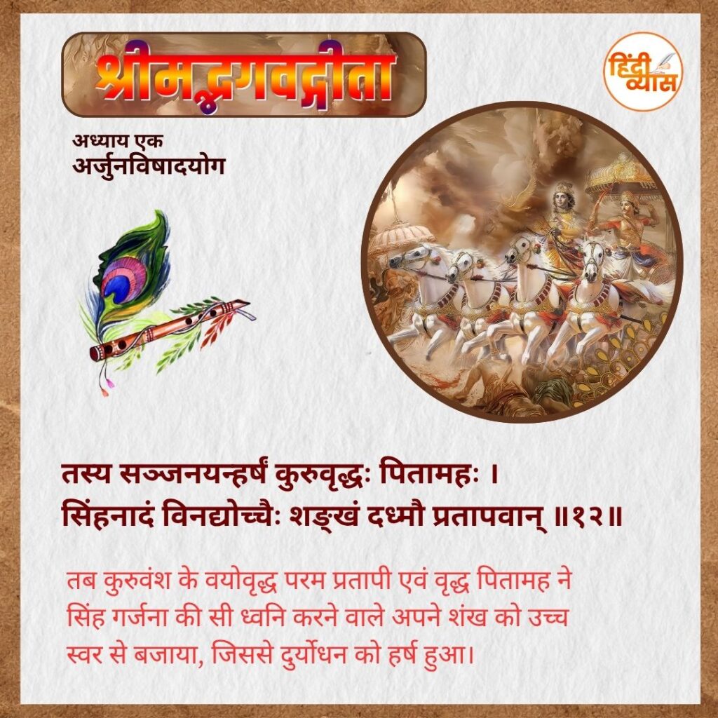 तब कुरुवंश के वयोवृद्ध परम प्रतापी एवं वृद्ध पितामह ने सिंह गर्जना की सी ध्वनि करने वाले अपने शंख को उच्च स्वर से बजाया, जिससे दुर्योधन को हर्ष हुआ।