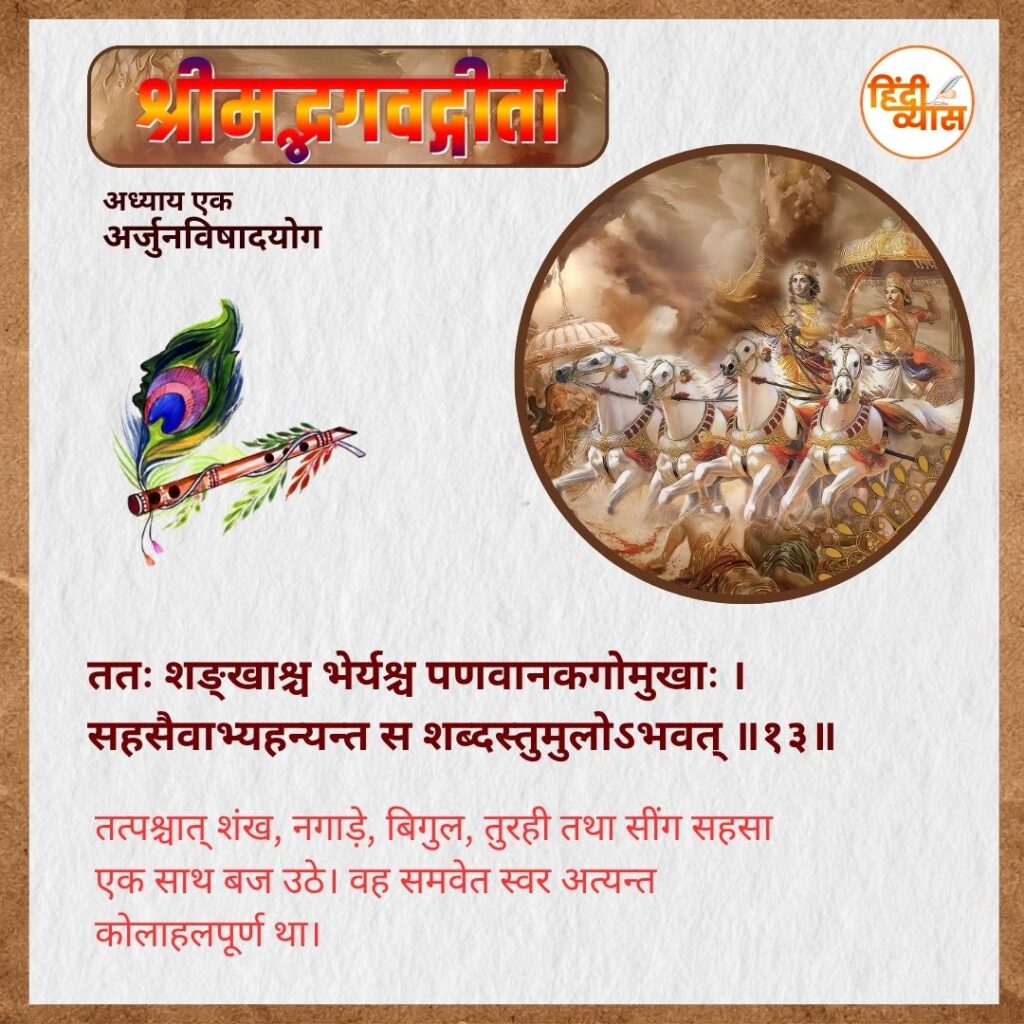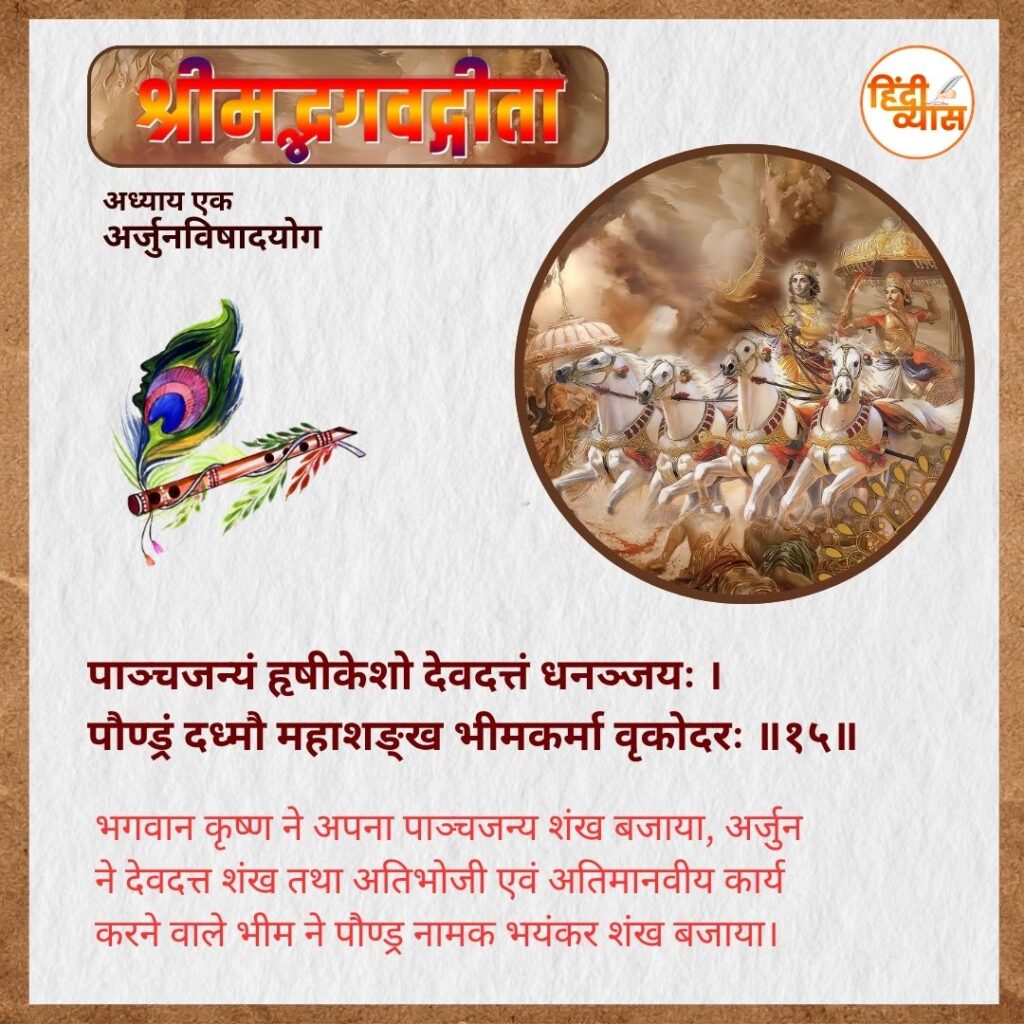 भगवान कृष्ण ने अपना पाञ्चजन्य शंख बजाया, अर्जुन ने देवदत्त शंख तथा अतिभोजी एवं अतिमानवीय कार्य करने वाले भीम ने पौण्ड्र नामक भयंकर शंख बजाया।