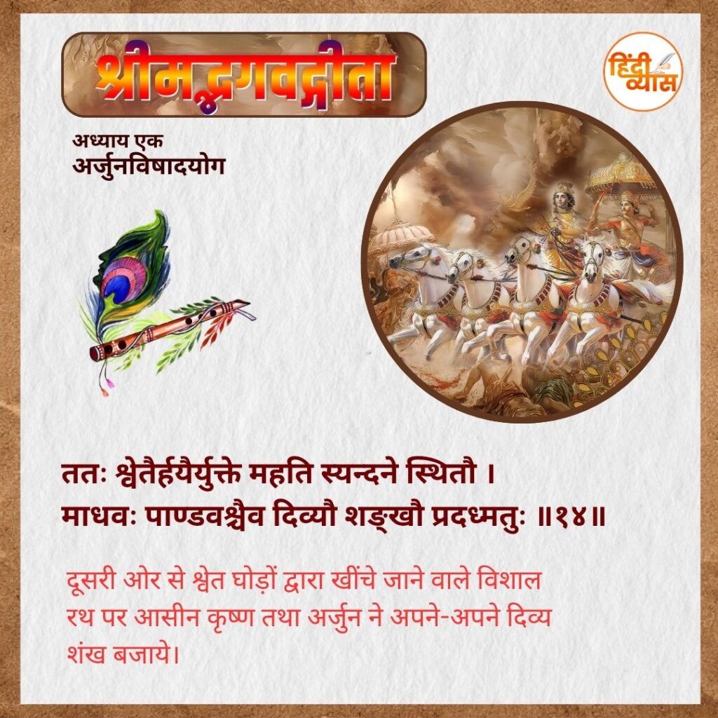 दूसरी ओर से श्वेत घोड़ों द्वारा खींचे जाने वाले विशाल रथ पर आसीन कृष्ण तथा अर्जुन ने अपने-अपने दिव्य शंख बजाये।