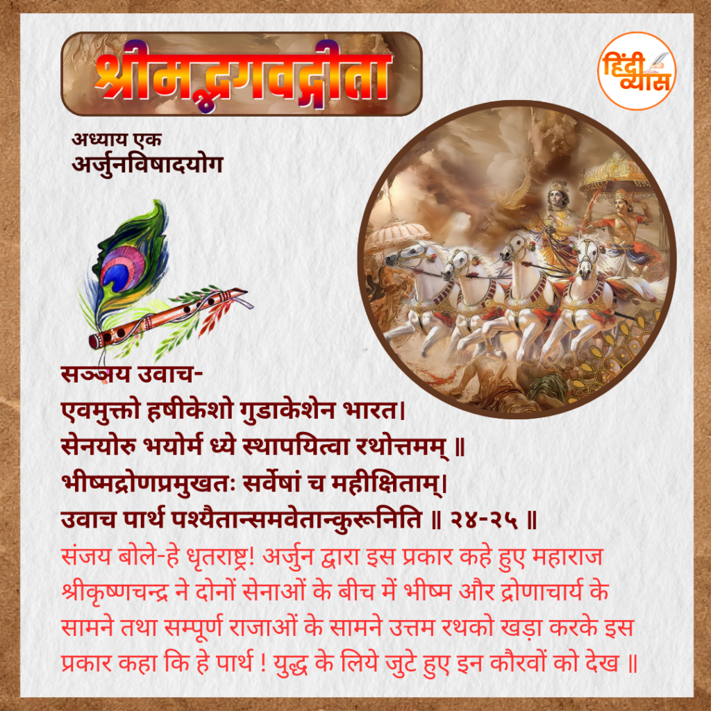 संजय बोले-हे धृतराष्ट्र! अर्जुन द्वारा इस प्रकार कहे हुए महाराज श्री कृष्णचन्द्र ने दोनों सेनाओं के बीच में भीष्म और द्रोणाचार्य के सामने तथा सम्पूर्ण राजाओं के सामने उत्तम रथ को खड़ा करके इस प्रकार कहा कि हे पार्थ ! युद्ध के लिये जुटे हुए इन कौरवों को देख ॥