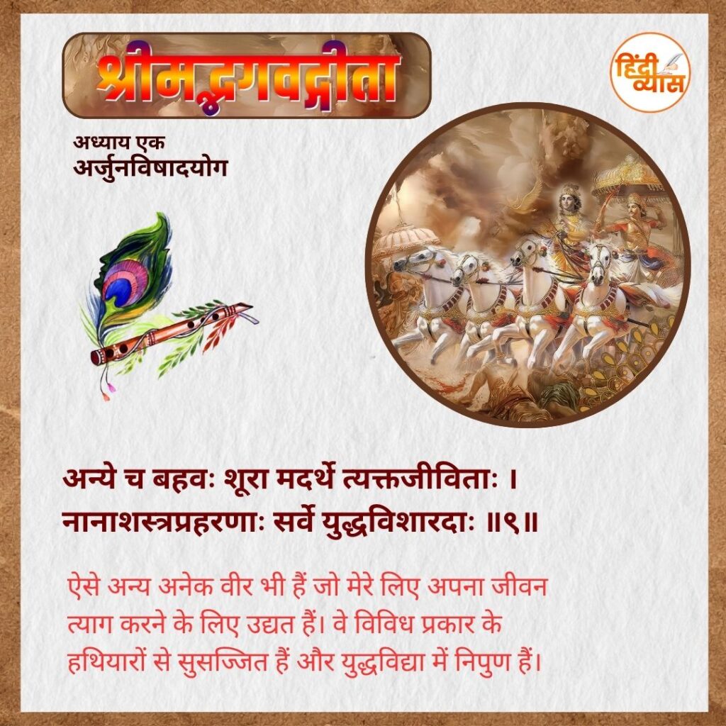 ऐसे अन्य अनेक वीर भी हैं जो मेरे लिए अपना जीवन त्याग करने के लिए उद्यत हैं। वे विविध प्रकार के हथियारों से सुसज्जित हैं और युद्धविद्या में निपुण हैं।