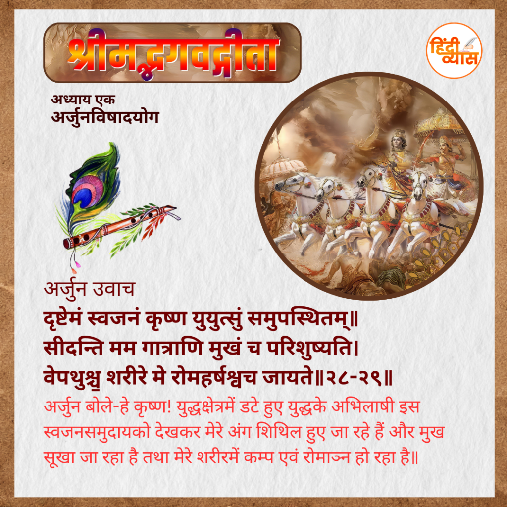 अर्जुन बोले-हे कृष्ण! युद्ध क्षेत्र में डटे हुए युद्ध के अभिलाषी इस स्वजन समुदाय को देखकर मेरे अंग शिथिल हुए जा रहे हैं और मुख सूखा जा रहा है तथा मेरे शरीर में कम्प एवं रोमाञ्न हो रहा है॥