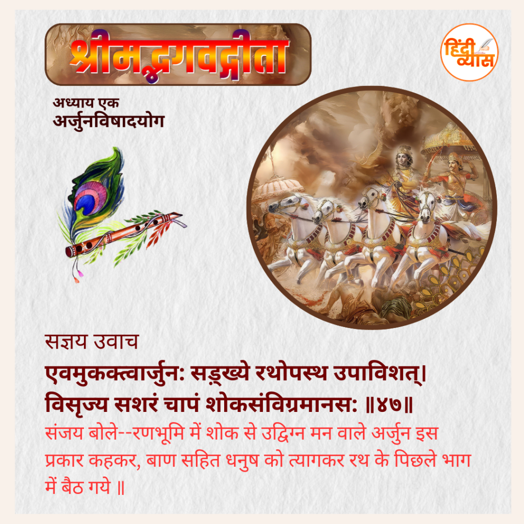 संजय बोले–रणभूमि में शोक से उद्विग्न मन वाले अर्जुन इस प्रकार कहकर, बाण सहित धनुष को त्यागकर रथ के पिछले भाग में बैठ गये ॥