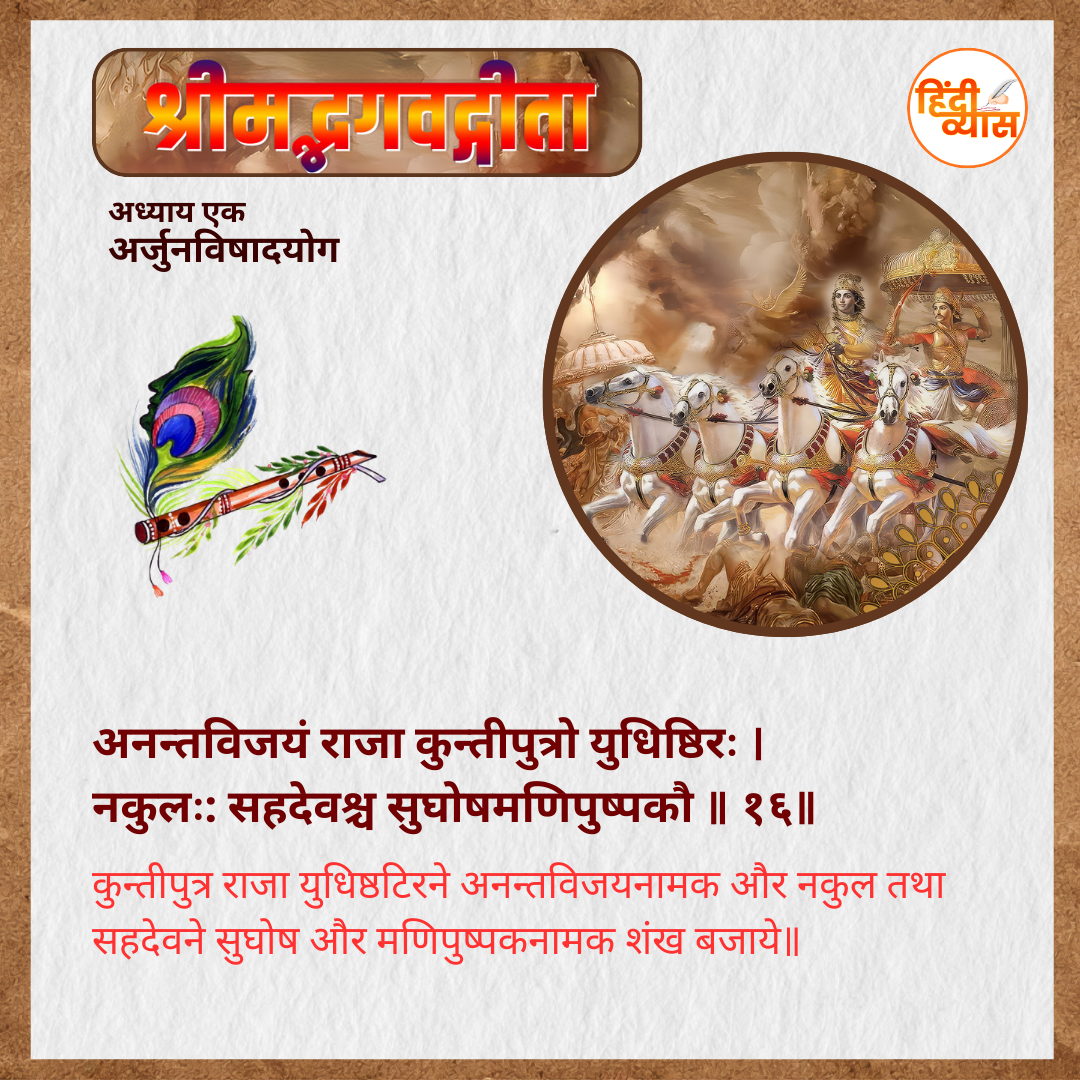 कुन्तीपुत्र राजा युधिष्ठटिरने अनन्तविजयनामक और नकुल तथा सहदेवने सुघोष और मणिपुष्पकनामक शंख बजाये॥