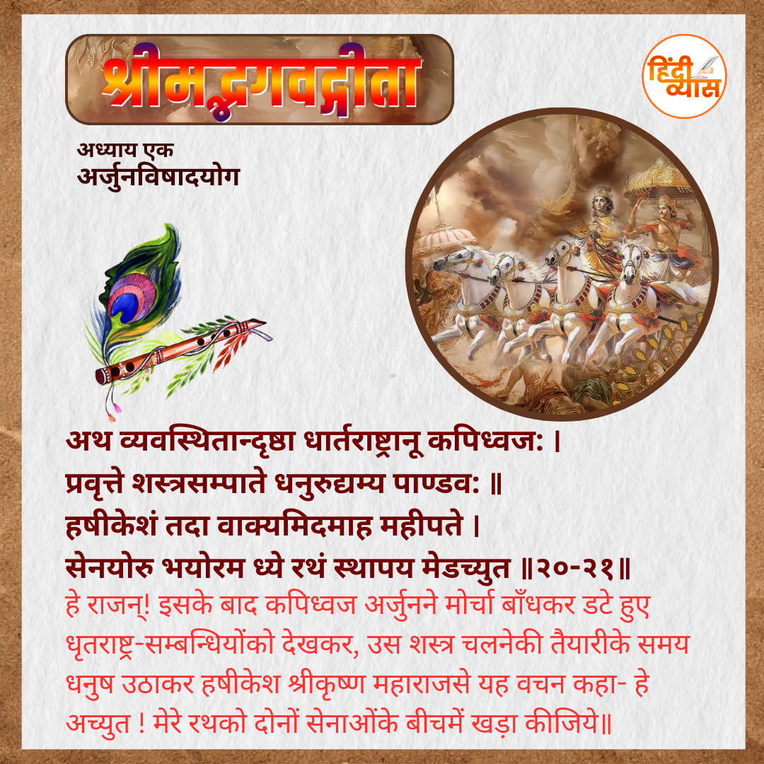सेनयोरु भयोरम ध्ये रथं स्थापय मेडच्युत॥२०-२१॥