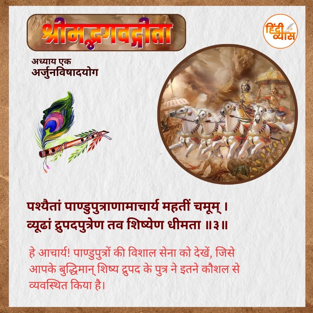 हे आचार्य! पाण्डुपुत्रों की विशाल सेना को देखें, जिसे आपके बुद्धिमान् शिष्य द्रुपद के पुत्र ने इतने कौशल से व्यवस्थित किया है।