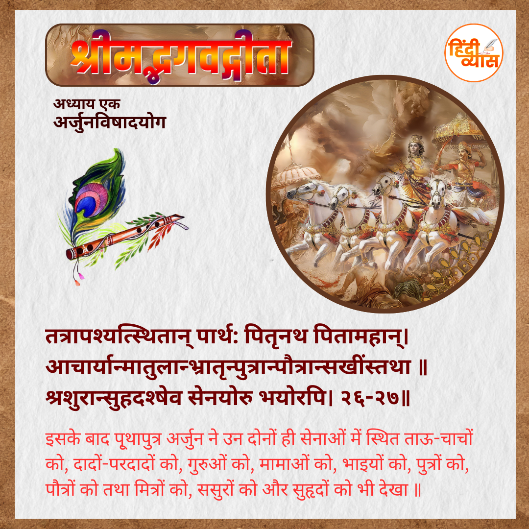 तत्रापश्यत्स्थितान् पार्थ: पितृनथ पितामहान्। आचार्यान्मातुलान्भ्रातृन्पुत्रान्पौत्रान्सखींस्तथा ॥ श्रशुरान्सुहदश्षेव सेनयोरु भयोरपि। २६-२७॥
