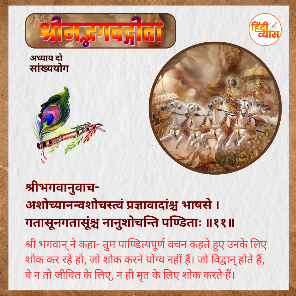 श्रीभगवान् बोले–हे अर्जुन ! तू न शोक करने योग्य मनुष्यों के लिये शोक करता है और पण्डितोंके-से वचनों को कहता है; परंतु जिनके प्राण चले गये हैं, उनके लिये और जिनके प्राण नहीं गये हैं उनके लिये भी पण्डितजन शोक नहीं करते॥