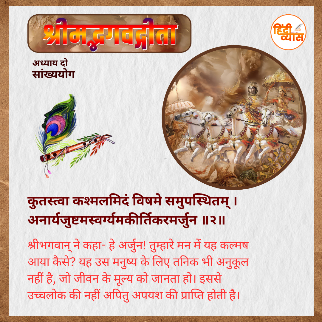 कुतस्त्वा कश्मलमिदं विषमे समुपस्थितम् । अनार्यजुष्टमस्वर्ग्यमकीर्तिकरमर्जुन ॥२॥