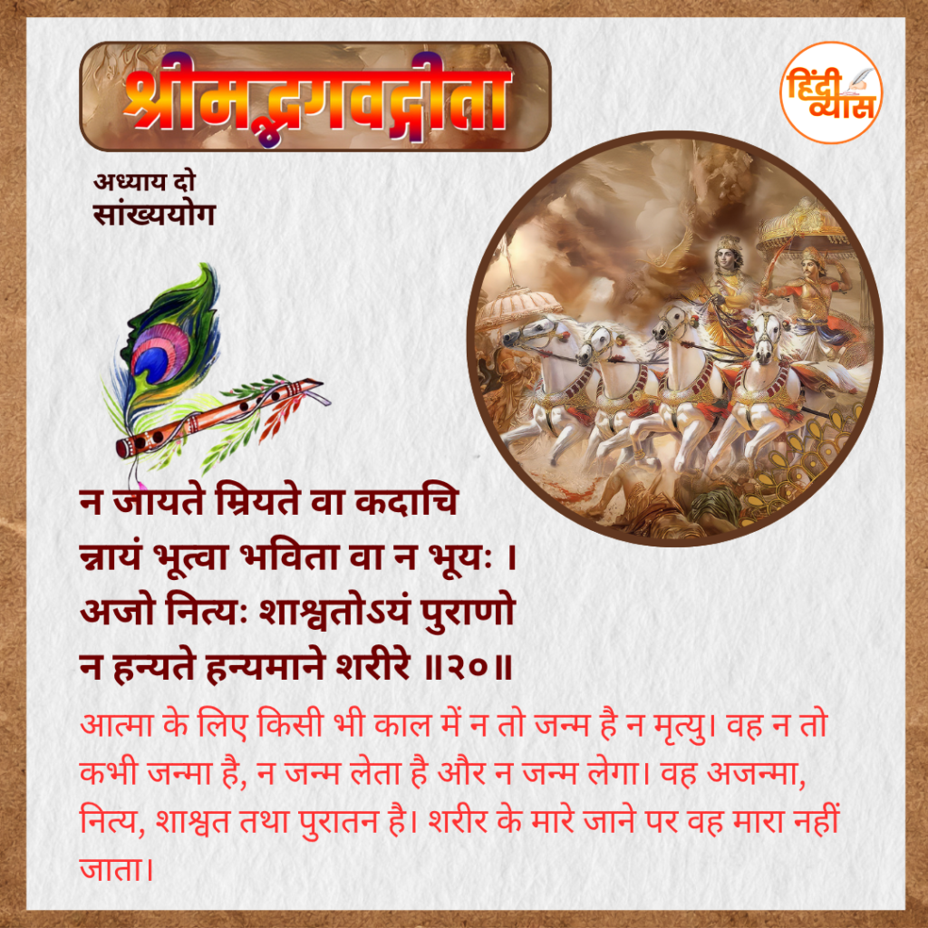 यह आत्मा किसी काल में भी न तो जन्मता है और न मरता ही है तथा न यह उत्पन्न होकर फिर होने वाला ही है; क्योंकि यह अजन्मा, नित्य, सनातन और पुरातन है; शरीर के मारे जाने पर भी यह नहीं मारा जाता॥