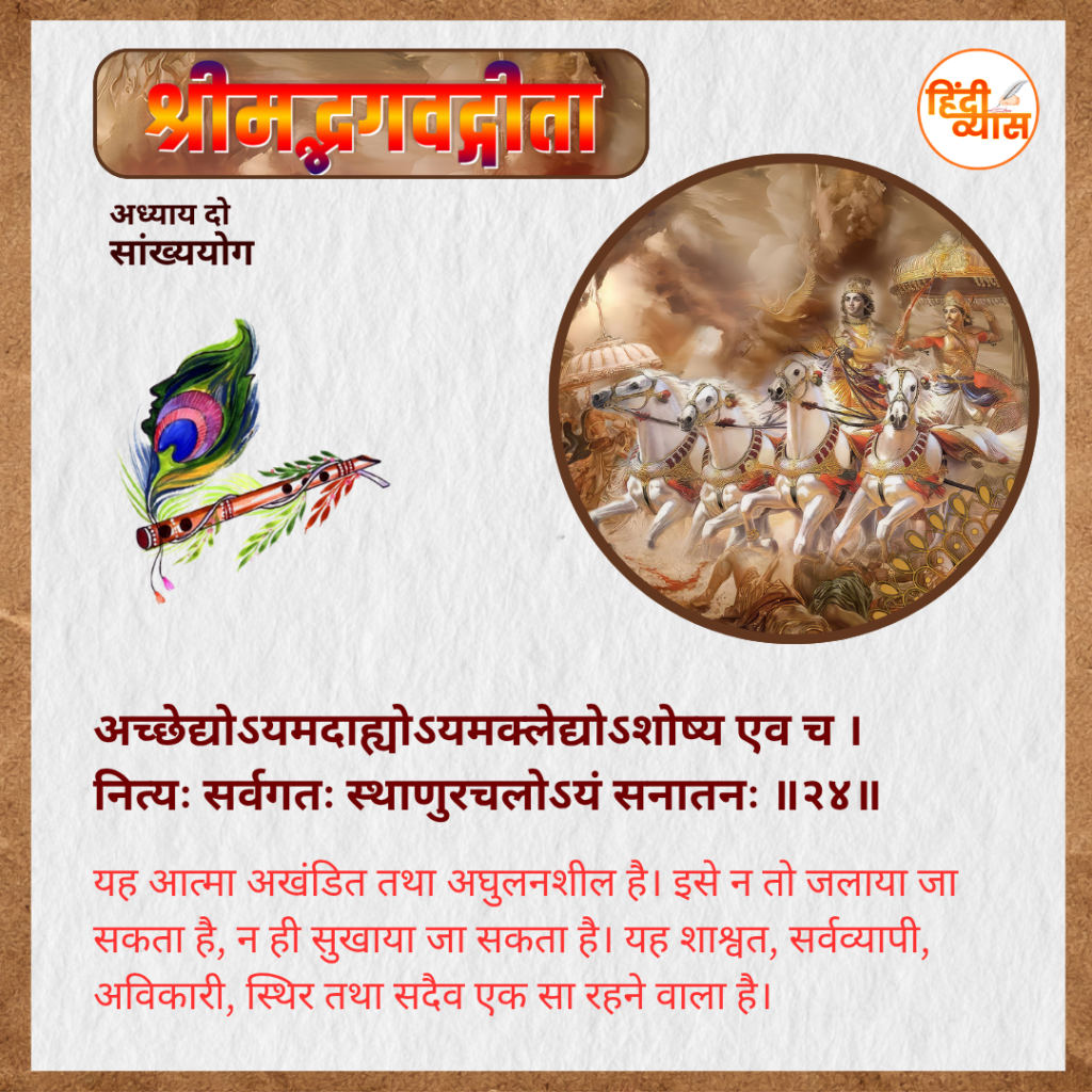 इस आत्मा को शस्त्र नहीं काट सकते, इसको आग नहीं जला सकती, इसको जल नहीं गला सकता और वायु नहीं सुखा सकता॥