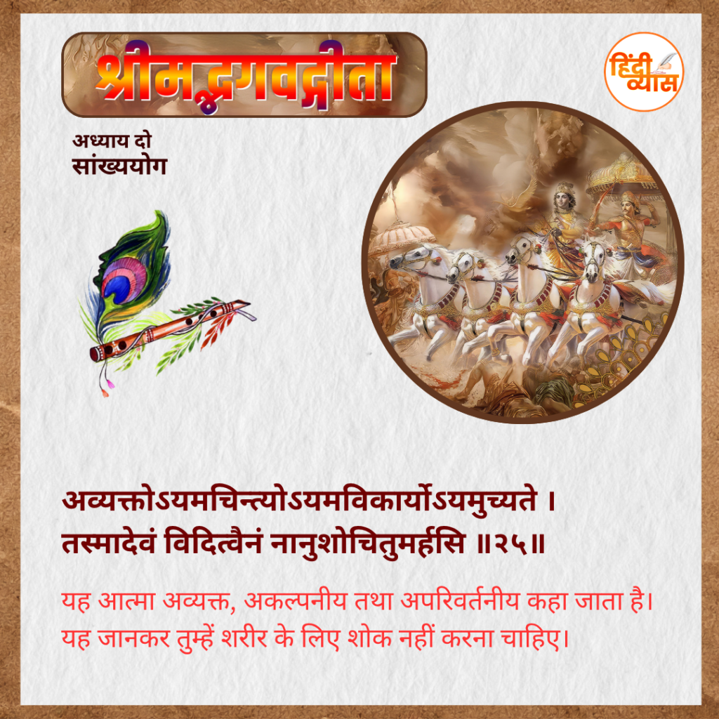 यह आत्मा अव्यक्त है, यह आत्मा अचिन्त्य है और यह आत्मा विकार रहित कहा जाता है। इससे हे अर्जुन! इस आत्माको उपर्युक्त प्रकार से जानकर तू शोक करने को योग्य नहीं है अर्थात् तुझे शोक करना उचित नहीं है॥