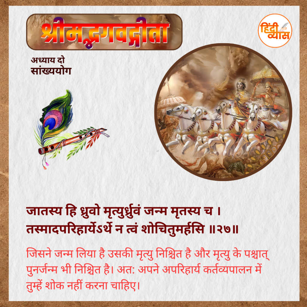 जातस्य हि श्रुवो मृत्युर्श्॑व॑ जन्म मृतस्य च। तस्मादपरिहार्ये5र्थ न त्वं शोचितुमरईसि॥२७॥