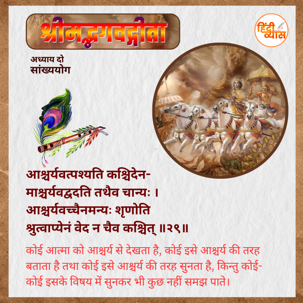 कोई एक महापुरुष ही इस आत्मा को आश्चर्य की भाँति देखता है और वैसे ही दूसरा कोई महापुरुष ही इसके तत्त्वका आश्चर्य की भाँति वर्णन करता है तथा दूसरा कोई अधिकारी पुरुष ही इसे आश्चर्य की भाँति सुनता है और कोई-कोई तो सुनकर भी इसको नहीं जानता॥
