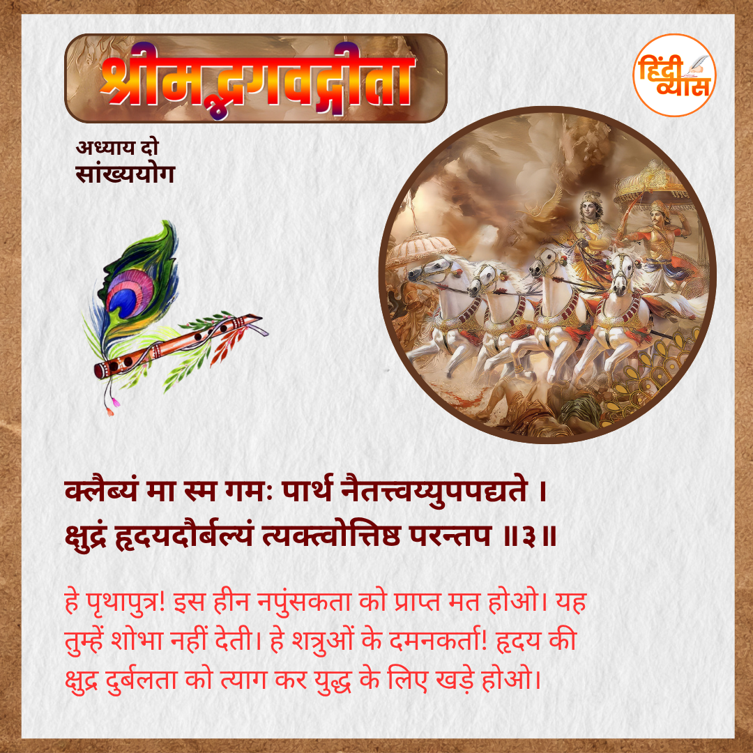 इसलिये हे अर्जुन ! नपुंसकताको मत प्राप्त हो, तुझमें यह उचित नहीं जान पड़ती। हे परंतप! हृदय की तुच्छ दुर्बलता को त्यागकर युद्ध के लिये खड़ा हो जा॥