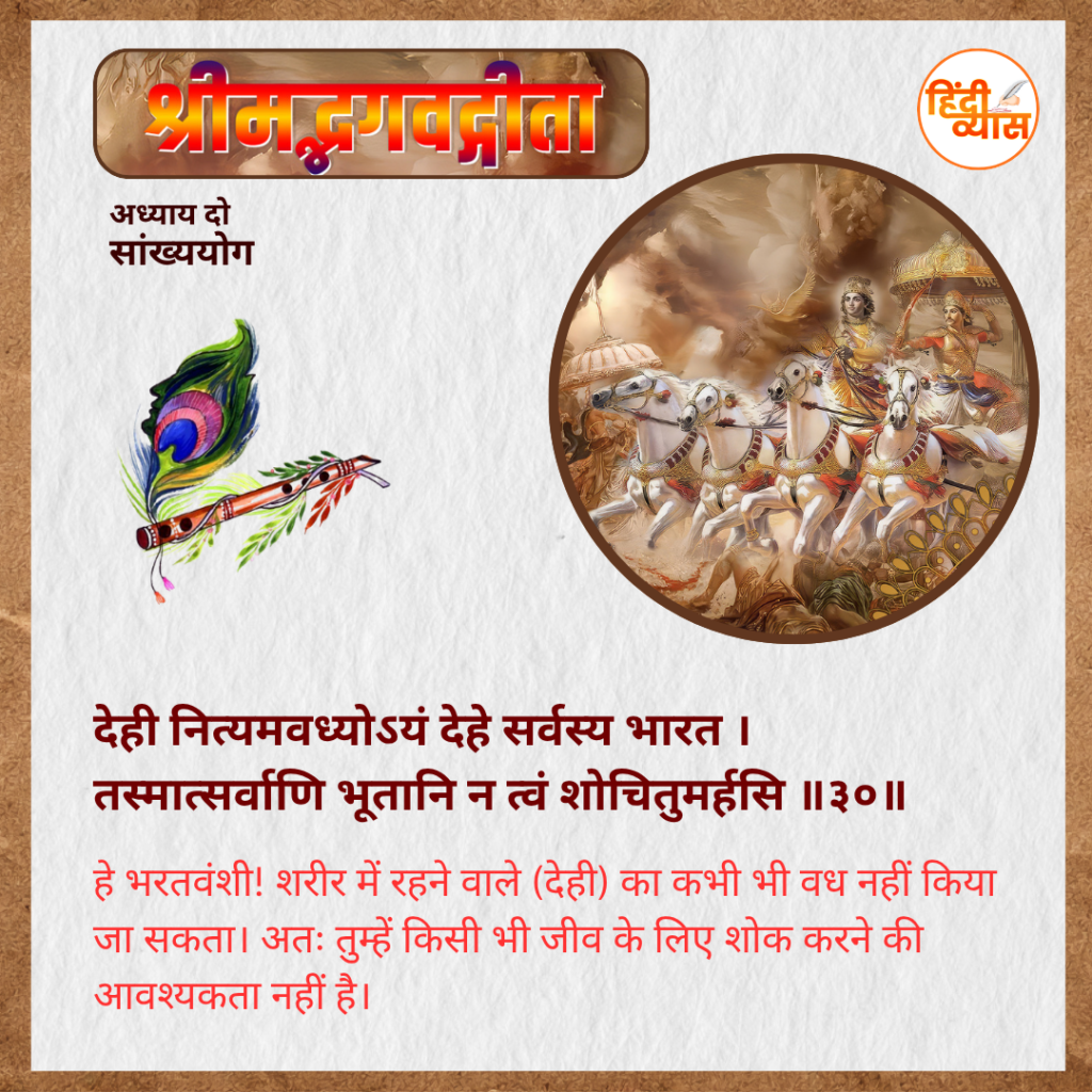 हे अर्जुन! यह आत्मा सबके शरीरों में सदा ही अवध्य* है । इस कारण सम्पूर्ण प्राणियों के लिये तू शोक करने के योग्य नहीं है ॥