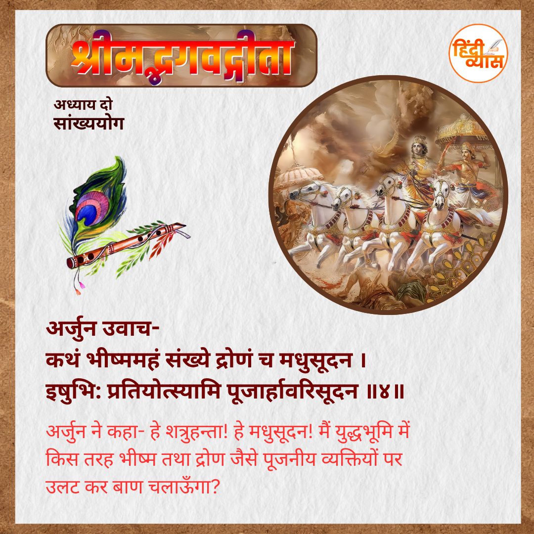 अर्जुन बोले-हे मधुसूदन ! मैं रणभूमि में किस प्रकार बाणों से भीष्म पितामह और द्रोणाचार्य के विरुद्ध लडूंगा ? क्योंकि हे अरिसूदन ! वे दोनों ही पूजनीय हैं ॥