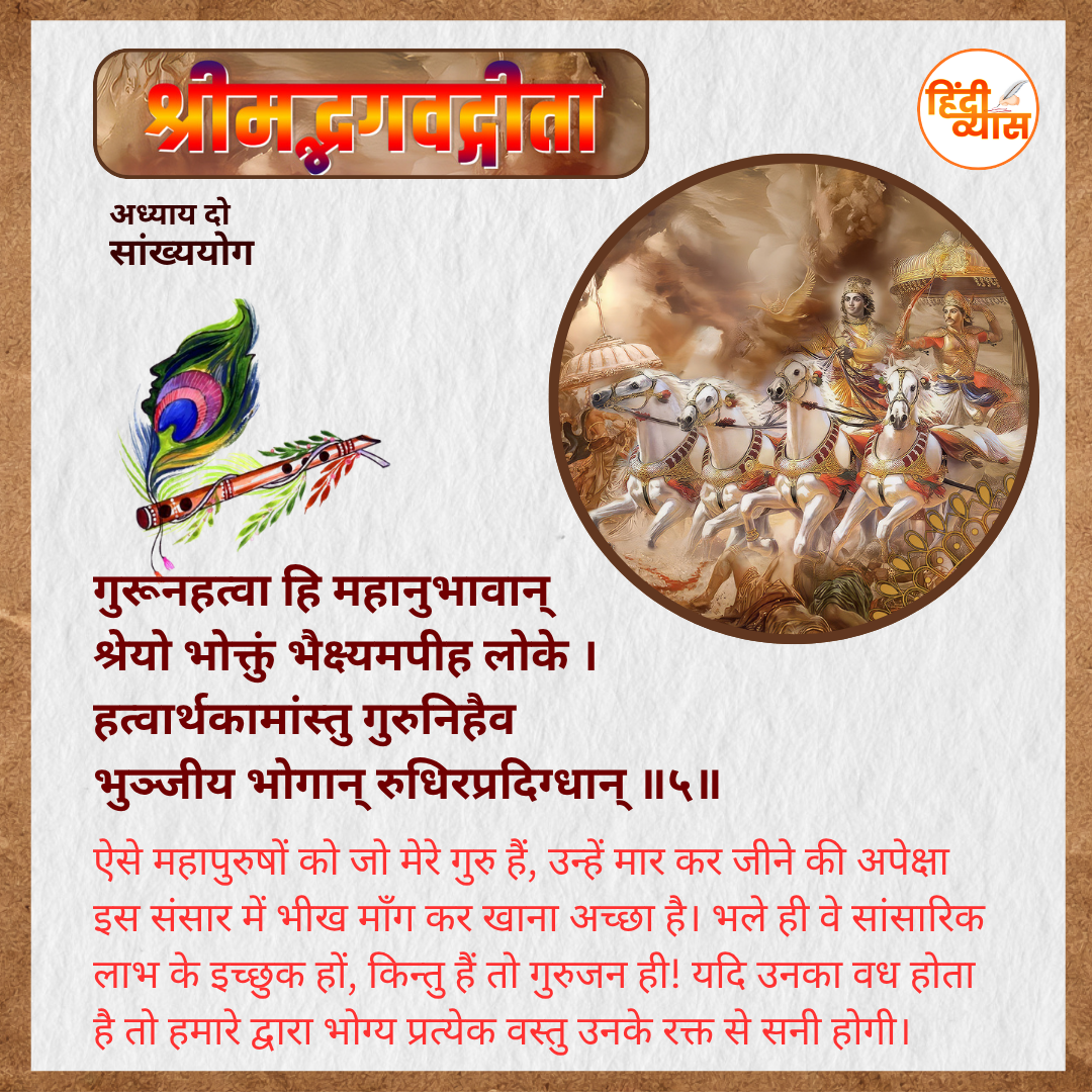 इसलिये इन महानुभाव गुरुजनों को न मारकर में इस लोक में भिक्षा का अन्न भी खाना कल्याण कारक समझता हूँ; क्योंकि गुरुजनों को मारकर भी इस लोक में रुधिर से सने हुए अर्थ और कामरूप भोगों को ही तो भोगूँगा॥