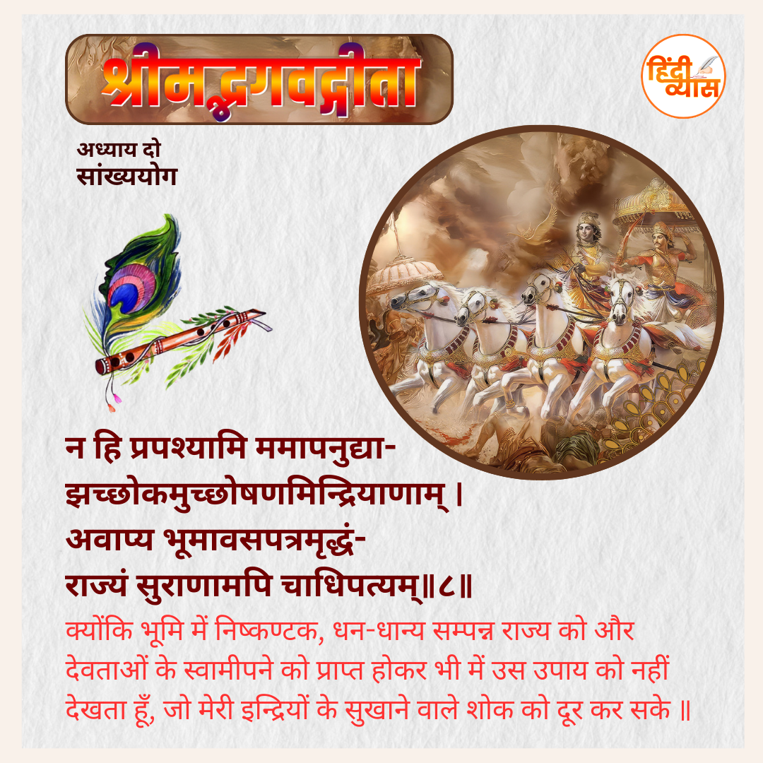 भगवद्गीता का द्वितीय अध्याय ‘सांख्य योग’ ज्ञान और कर्म के समन्वय का दार्शनिक आधार प्रस्तुत करता है। विषादग्रस्त अर्जुन को संबोधित करते हुए कृष्ण आत्मा की नित्य, अविनाशी और अजर-अमर सत्ता का प्रतिपादन करते हैं। वे समझाते हैं कि शरीर नश्वर है, पर आत्मा शाश्वत है; अतः मोह और शोक का त्याग कर कर्तव्यपालन ही धर्म है। इस अध्याय में स्थिर बुद्धि, समत्वभाव, निष्काम कर्म और आत्मज्ञान की महत्ता प्रतिपादित होती है। ‘सांख्य योग’ मानव को विवेकपूर्ण दृष्टि प्रदान कर जीवन के संघर्षों में संतुलित, निर्भीक और कर्मनिष्ठ बनने की प्रेरणा देता है।